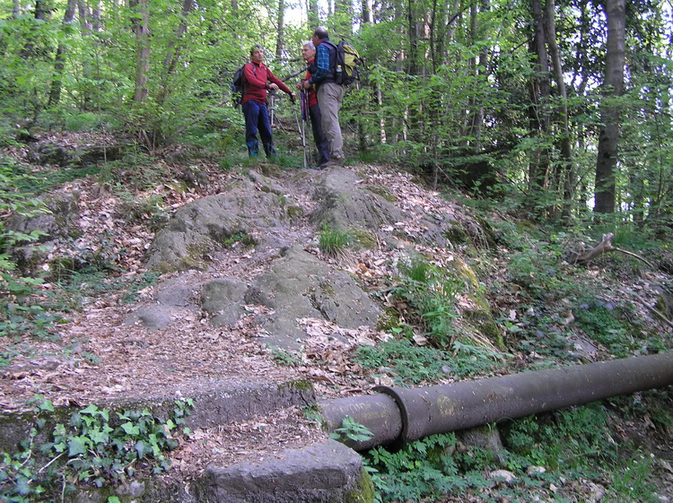 di un grosso tubo acquedotto c'è il sentiero di salita con frecce
