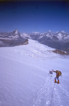 | Trascorsa la notte iniziamo la salita contemplando il Rosa. | Subito dopo ila partenza, già alla prova con corde e passaggi aerei. |