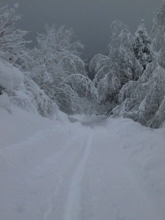 | Tra piante e rami coperti di neve usciamo dalla boscaglia... | ..la nostra traccia è profonda e ben marcata...beati quelli che seguiranno! |