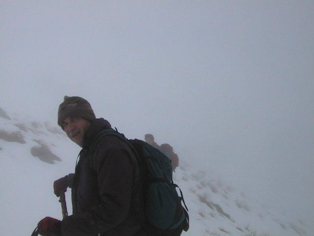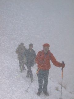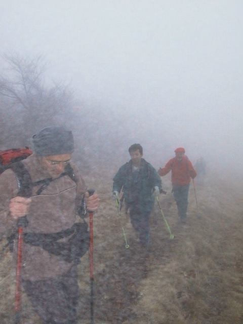 | Li abbiamo superati e sempre nella nebbia che presto si trasforma in... | ...neve, saliamo al pian Vada, dove incontriamo, già al ritorno... |