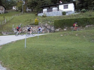 | ..ad un bivio, mentre si attende di conoscere da che parte andare Joel ammira una bella bici... | ...e dopo una bella discesa su sterrato, eccoci sull'asfalto che ci porterà a Bidogno. |