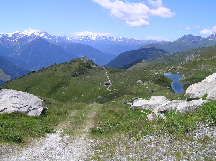 | ...lasciamo Fiescheralp in direzione di Bettmeralp... | ...saliamo una collinetta ed ecco un bel laghetto sotto di noi... |