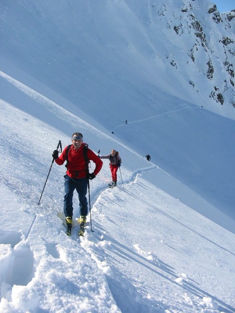 | ...il gruppo si mantiene abbastanza compatto... | ...la neve č crostosa quasi fino alla sella... |