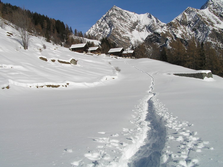 Si lascia l'auto ad Alagna Valsesia (1190 m), si attraversa il paese sulla sinistra e cartelli indicano il sentiero che conduce alla Val D'Otro. Si percorre prima un fitto bosco poi si arriva su un bel piano contornato da diversi villaggi walser: Follu (1664 m), Dorf (1640 m), Scarpia (1726 m) fino ad arrivare a Pianmisura Piccola (1782m) e Grande (1857 m). (circa 3,00 ore) |